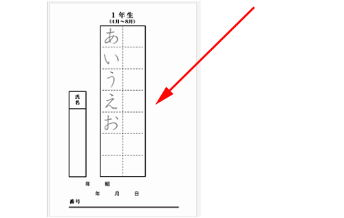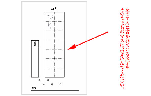 マスの左側に書かれている文字を右側のマスにペンで同じように真似て書きます。原稿用紙に書く文字は所定の用紙にお手本がありますのでその通り書いてください。