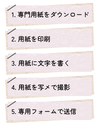 用紙に記載の要領に従って文字を書いてください。用紙の文字を分析診断の後、個々にトレーニング方法をメールにてお知らせいたします。
